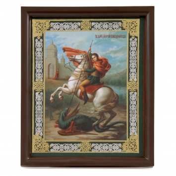 Икона на оргалите 6х9 двойное тиснение, рамка пластмассовая, упаковка Чудо Георгия о змие