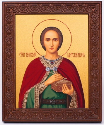 Икона на дереве 18х22 прокат, ковчег с резным обрамлением, упаковка Пантелеимон 1