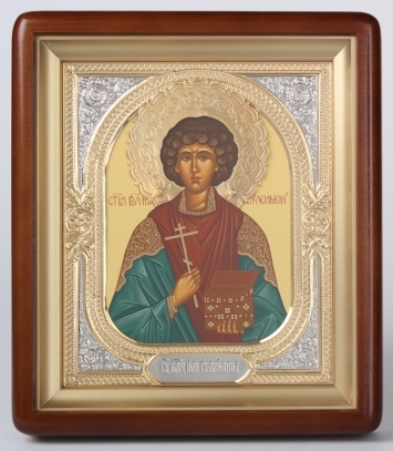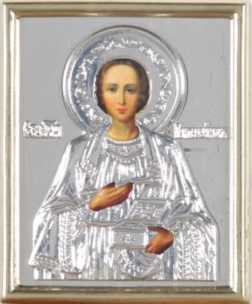 Икона в пластмассовой рамке 4х5 металлизированная риза Пантелеимон