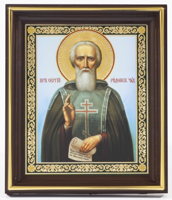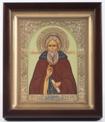 Икона в деревянной рамке №1 13х15 тиснение с венчиком Сергий Радонежский 11