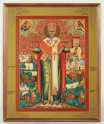 Икона в деревянной рамке №1 30х40 двойное тиснение, упаковка Николай Чудотворец с житием 01