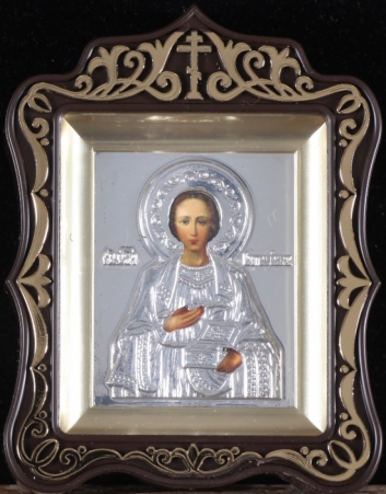 Икона в пластмассовой рамке Киот 6х7 резной металлизированный Пантелеимон