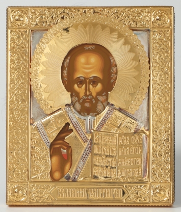 Икона в штампованном окладе 11*13 серебро / киот / золочение / Николай Чудотворец (УИН)