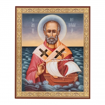 Икона на доске 18х24 золоченое покрытие, объёмная печать, лак Николай Чудотворец 3 (с красной рамкой)