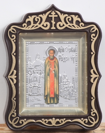 Икона в пластмассовой рамке Киот 6х7 резной металлизированный с ризой Сергий Радонежский (ростовой)