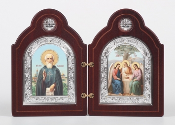 Складень резной Фигурный, икона 9х12 канвас, №2 Сергий Радонежский-Троица (Рубл.)