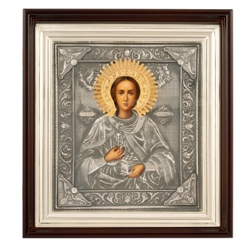 Икона живописная в киоте 24х30 масло, риза №132, черненое серебрение, киот №1 Пантелеимон