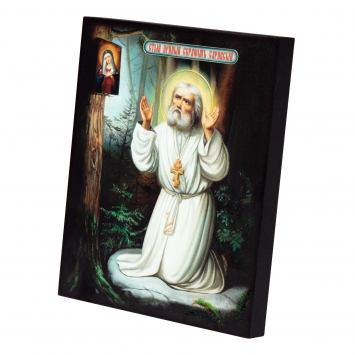 Икона на доске 13х15 объёмная печать, лак Моление Серафима Саровского на камне
