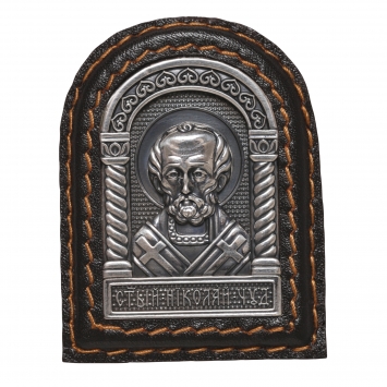 Икона в металлической рамке автомобильная на липкой ленте г / пластика кожа серебрение чернение Николай Чудотворец
