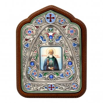 Икона настольная №156 гальванопластика, эмаль, деколь, в деревянной рамке / серебрение / Сергий Радонежский