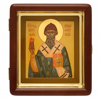 Икона живописная на доске в киоте 13х15 темпера, золоченый нимб, ковчег, киот №1 Спиридон Тримифунтский, 00158