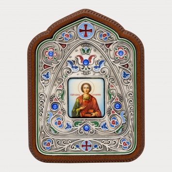 Икона настольная №156 гальванопластика, эмаль, деколь, в деревянной рамке / серебрение / Пантелеимон