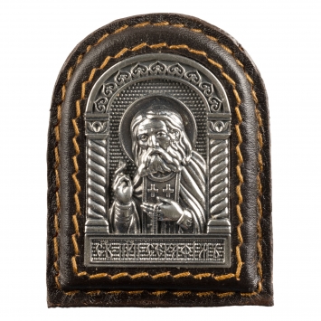 Икона в металлической рамке автомобильная на липкой ленте г / пластика кожа серебрение чернение Серафим Саровский