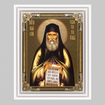 Икона в деревянной рамке №3 11х13 (белая) двойное тиснение Паисий Святогорец 2