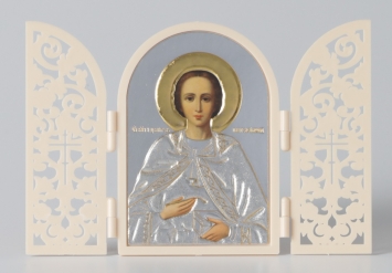 Икона в пластмассовой рамке Складень 5х7,5 арочный резной Пантелеимон