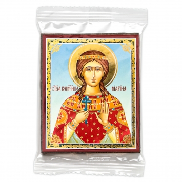 Икона на деревянном планшете 6х9 двойное тиснение, аннотация, упаковка Марина Антиохийская, вмц. (2)