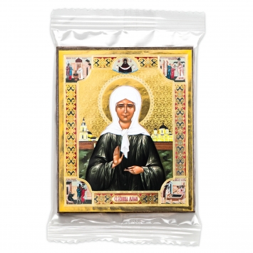 Икона на деревянном планшете 6х9 двойное тиснение, аннотация, упаковка Матрона Московская (с клеймами) (2)