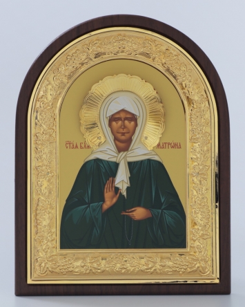 Икона в ризе 18х24 арочная, планшет, рамка, венчик золочёные, темпера, упаковка Матрона Московская (с венчиком)