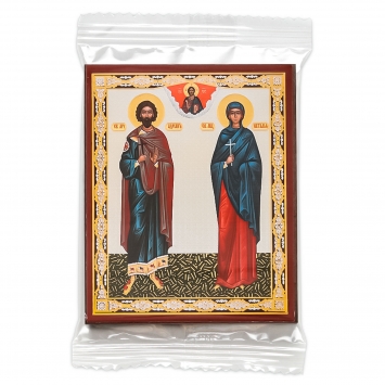 Икона на деревянном планшете 6х9 двойное тиснение, аннотация, упаковка Петр и Феврония 2