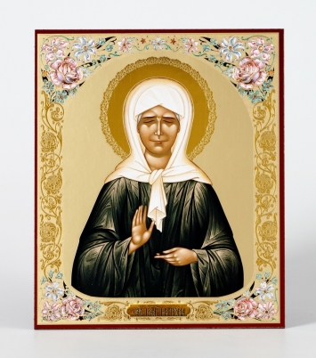 Икона на оргалите №1 18х24 двойное тиснение Матрона Московская (рамка с цветами) 2