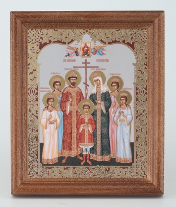 Икона на деревянном планшете 6х9 двойное тиснение, аннотация, упаковка Царская семья 3