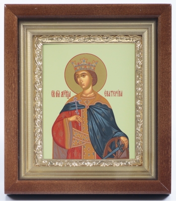 Икона в киоте 11х13 сложный, темпера, рамка золочёная Екатерина