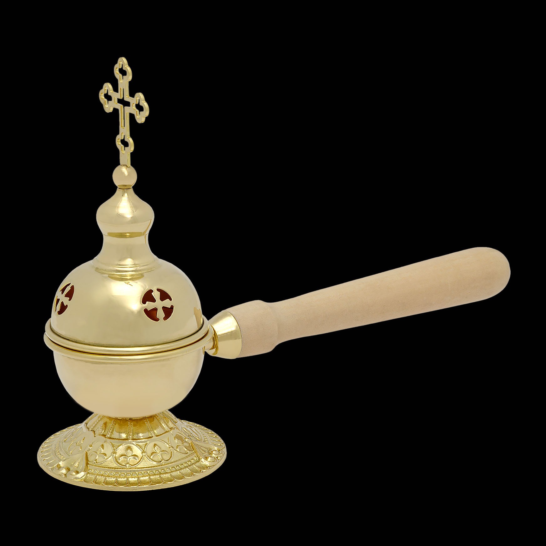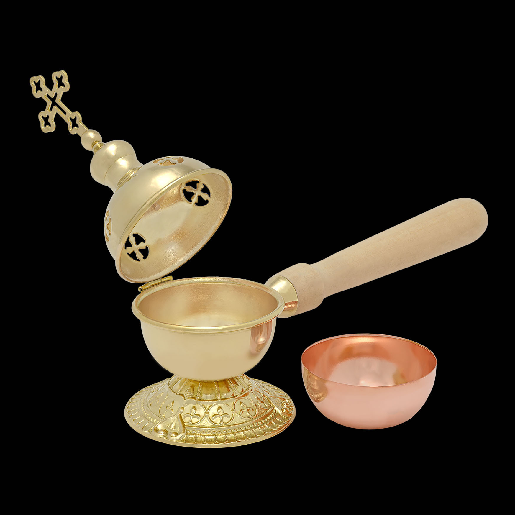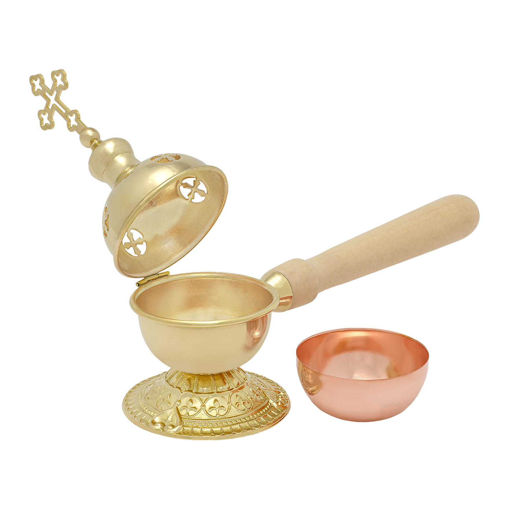 Данная кадильница, выполненная из латуни и меди, имеет деревянную ручку. Крышка кадильницы украшена прорезными четырехконечными крестами, которые выполняют роль отверстия для циркуляции воздуха и выхода благовонного дыма. Изделие укомплектовано вкладышем.