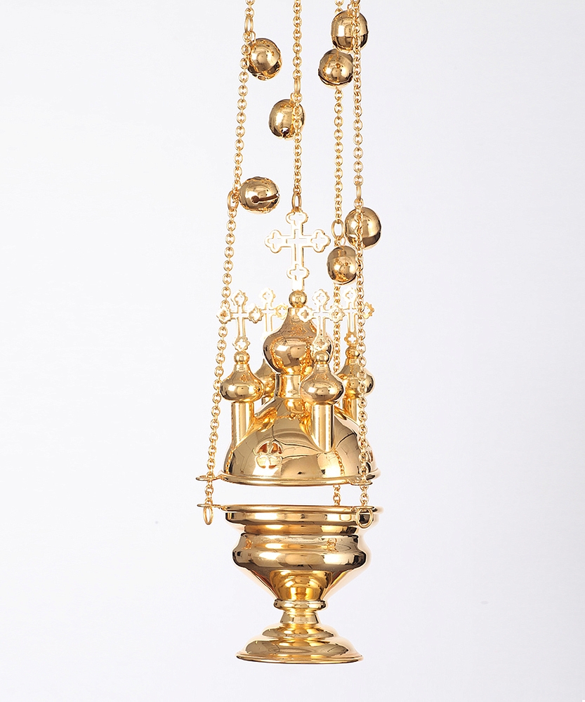 Главной особенностью кадила является крышка, увенчанная пятью куполами с восьмиконечными крестами. Выполненное из латуни и меди, изделие покрыто сияющей при свете паникадила и свечей позолотой. Изделие комплектуется круглым вкладышем и праздничными позвонцами.