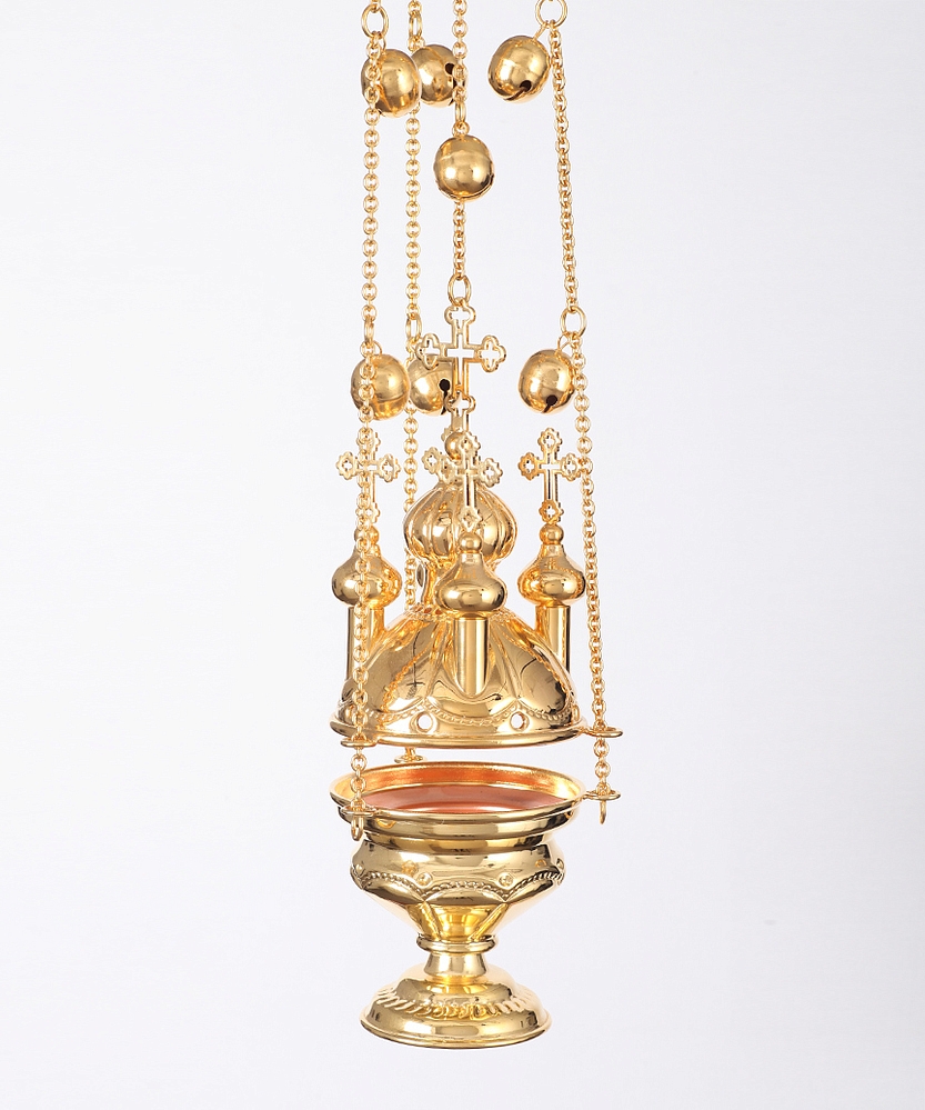 Главной особенностью кадила является крышка, увенчанная пятью куполами с восьмиконечными крестами. Выполненное из латуни и меди и покрытое позолотой, изделие украшено чеканными узорами и озвучено несколькими рядами позвонцов. Снизу кадило имеет удобную устойчивую подставку. Изделие комплектуется круглым вкладышем и праздничными позвонцами.