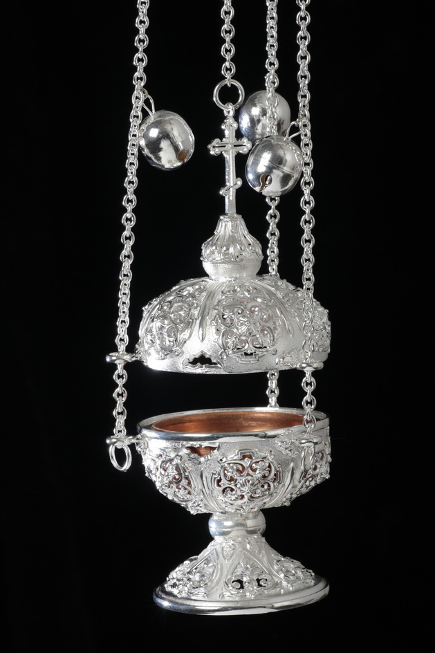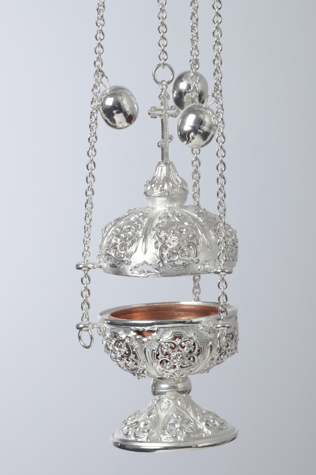 Нежное и воздушное кадило целиком состоит из литых серебряных кружев и мягкого звона, издаваемого позвонцами. Выполненное из латуни и меди, сверху кадило увенчано восьмиконечным крестом, а снизу – круглой устойчивой подставкой.