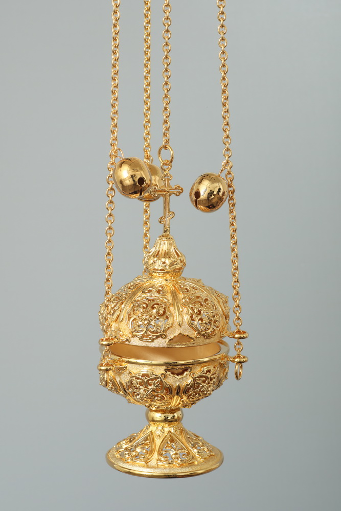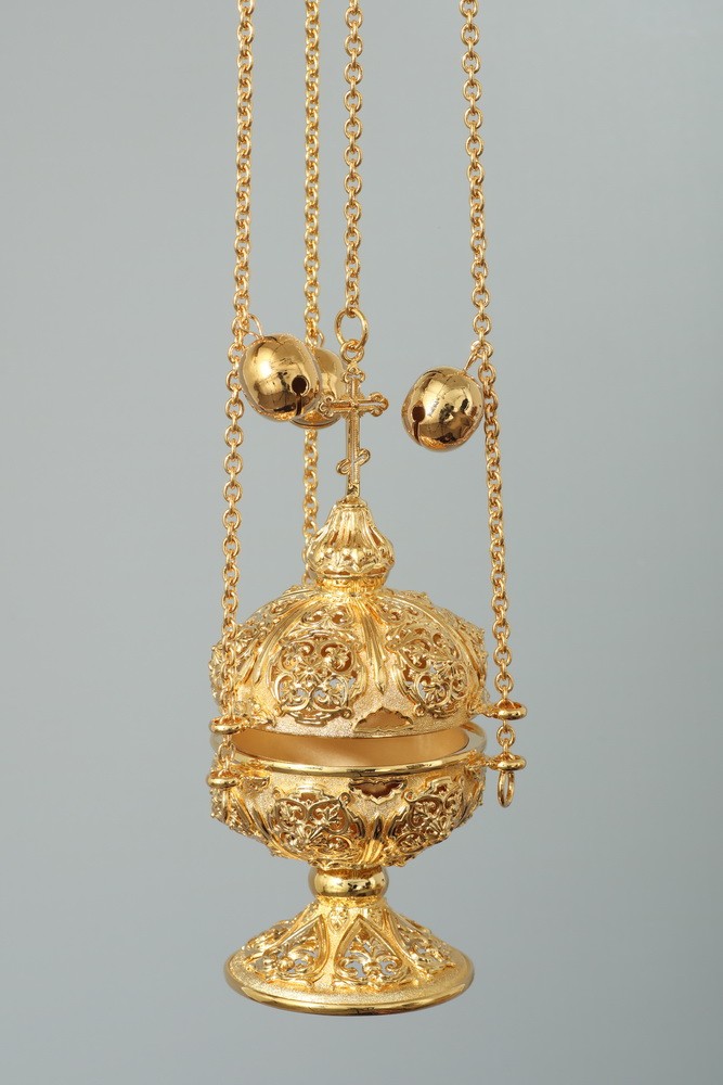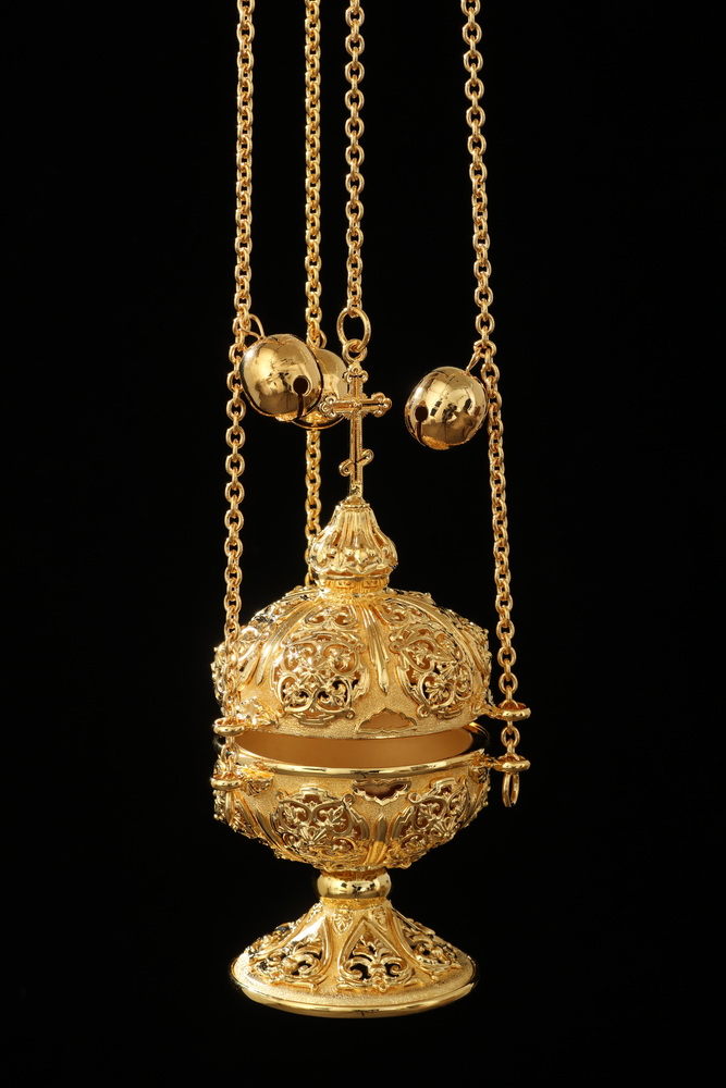Царственное и благородное кадило с бубенцами выполнено из латуни методом литья. Позолоченная поверхность кадила щедро украшена объемными и прорезными орнаментами. Крышка кадила увенчана восьмиконечным крестом.