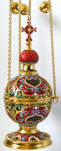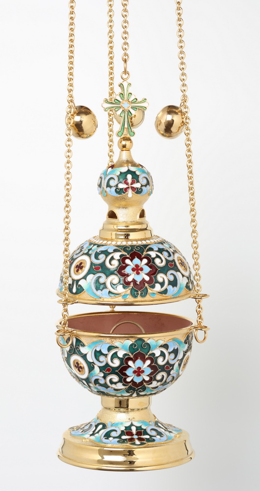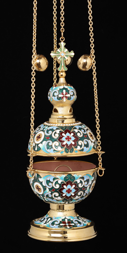 Яркое и праздничное кадило напоминает искусно украшенное пасхальное яйцо, увенчанное куполом с четырехконечным крестом. Изделие выполнено из латуни и меди и покрыто позолотой, на фоне которой ярко выделяются филигранные узоры, раскрашенные цветной эмалью. Цвет эмали может быть изменен по Вашему желанию.