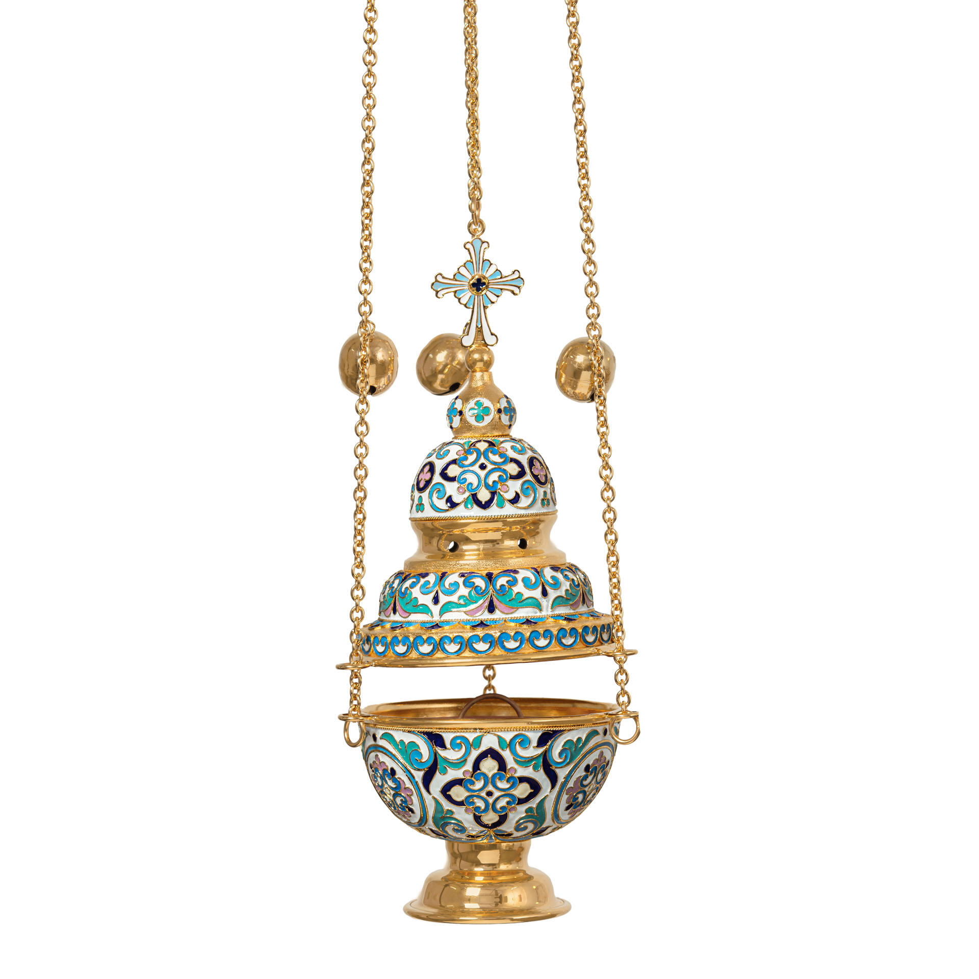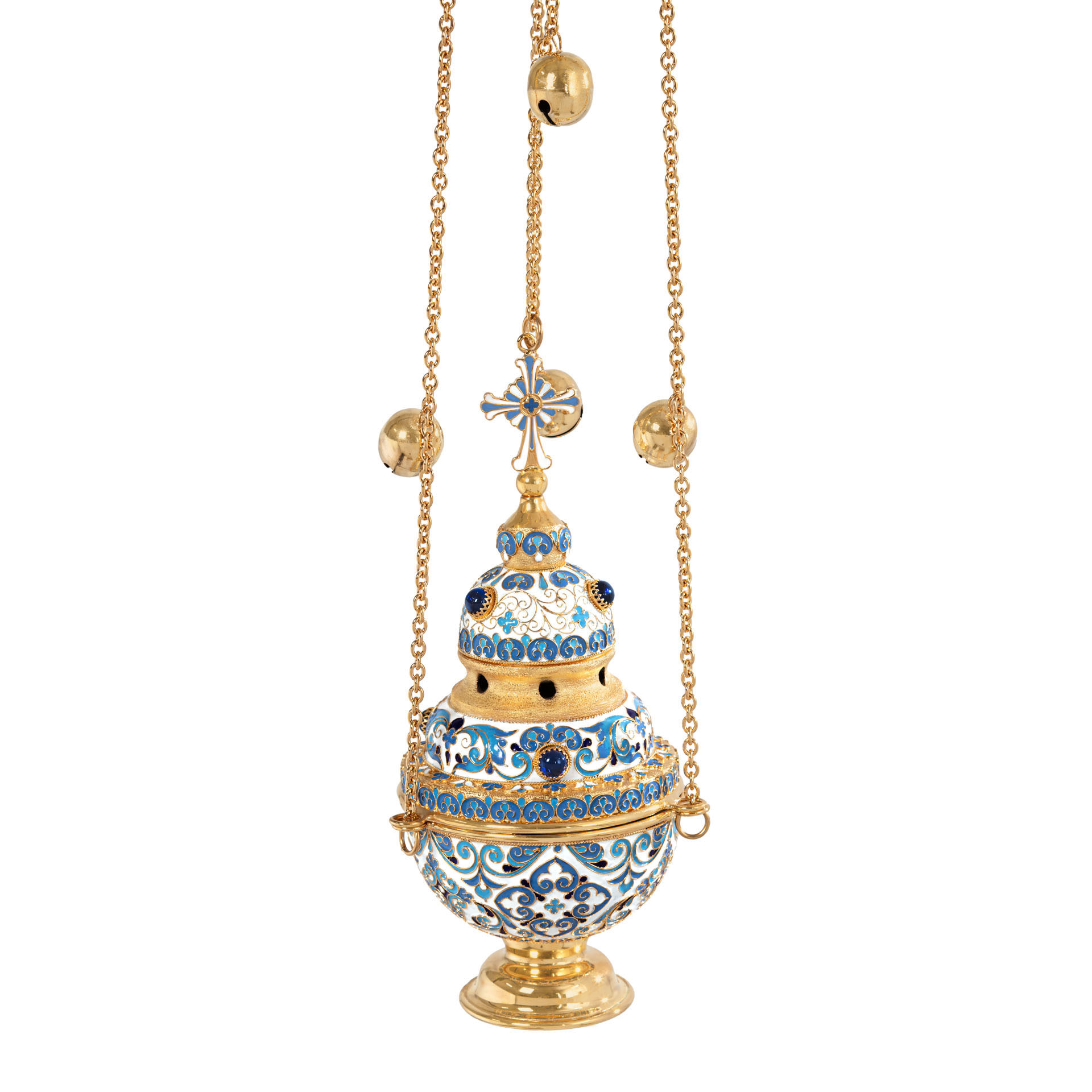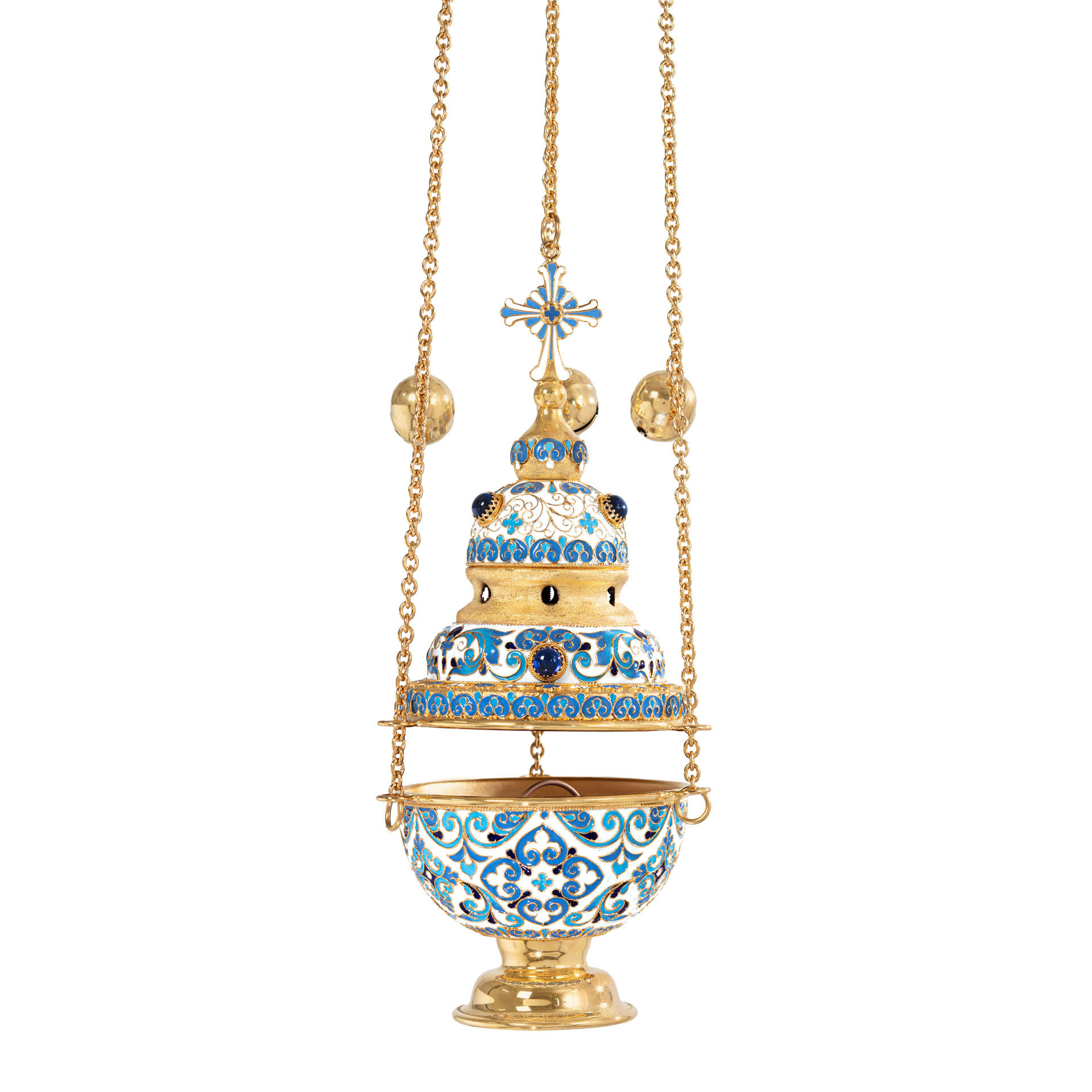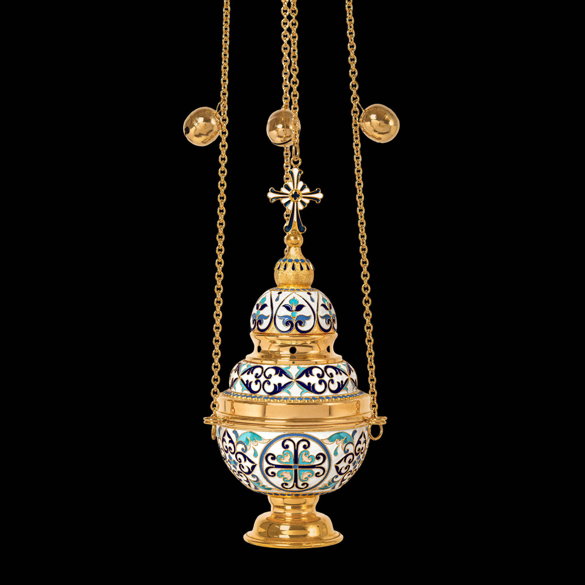 Праздничное и благородное кадило имеет необычную форму круглой трехэтажной часовни, увенчанной куполом и восьмиконечным крестом. Выполненное из латуни и меди и покрытое позолотой, кадило щедро украшено тонкими филигранными узорами и яркой эмалью, цвет которой может быть изменен. Крышка кадила имеет отверстия для циркуляции воздуха и выхода благовонного дыма.