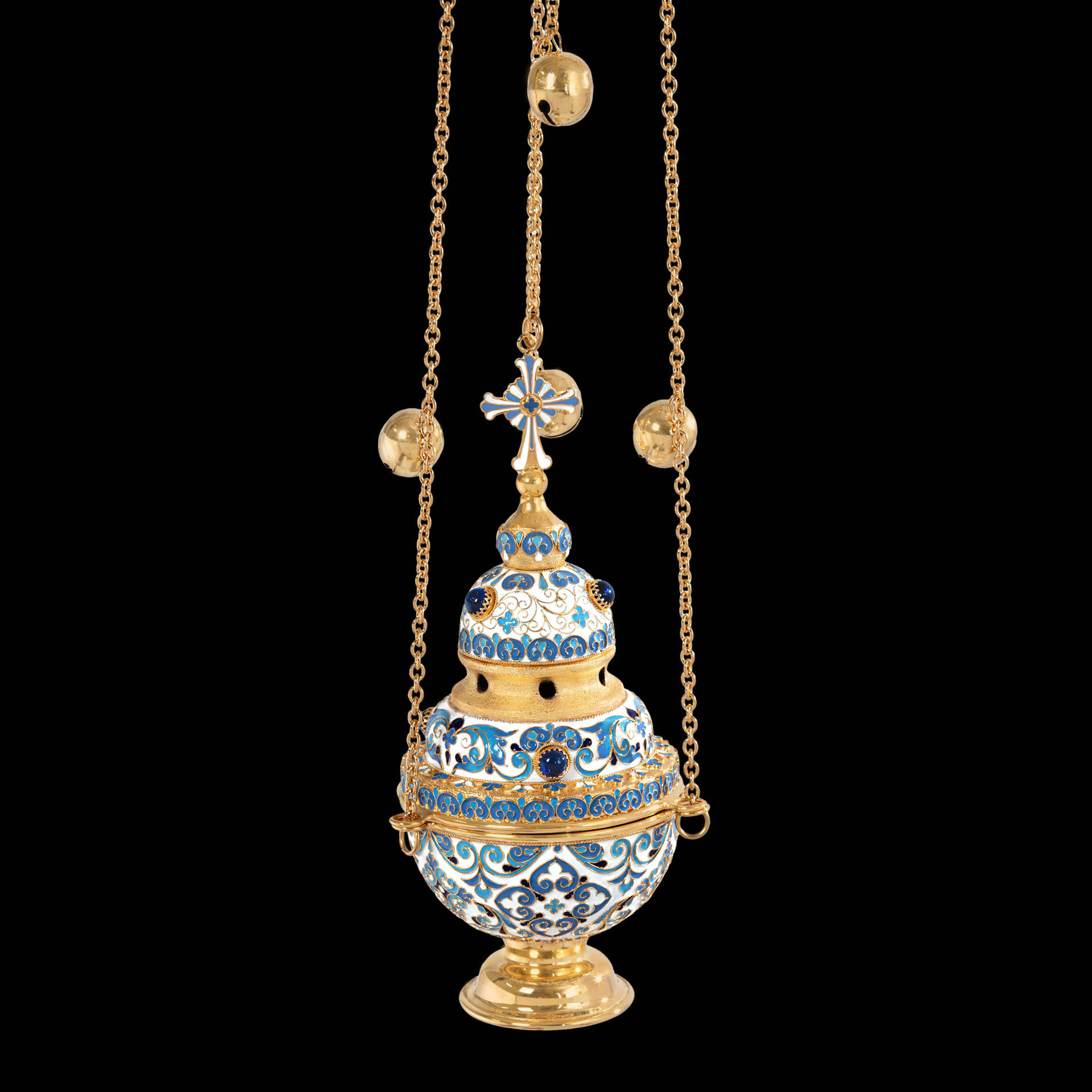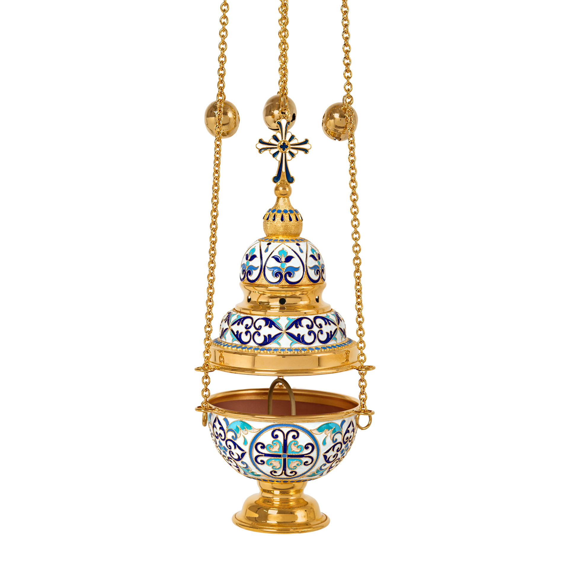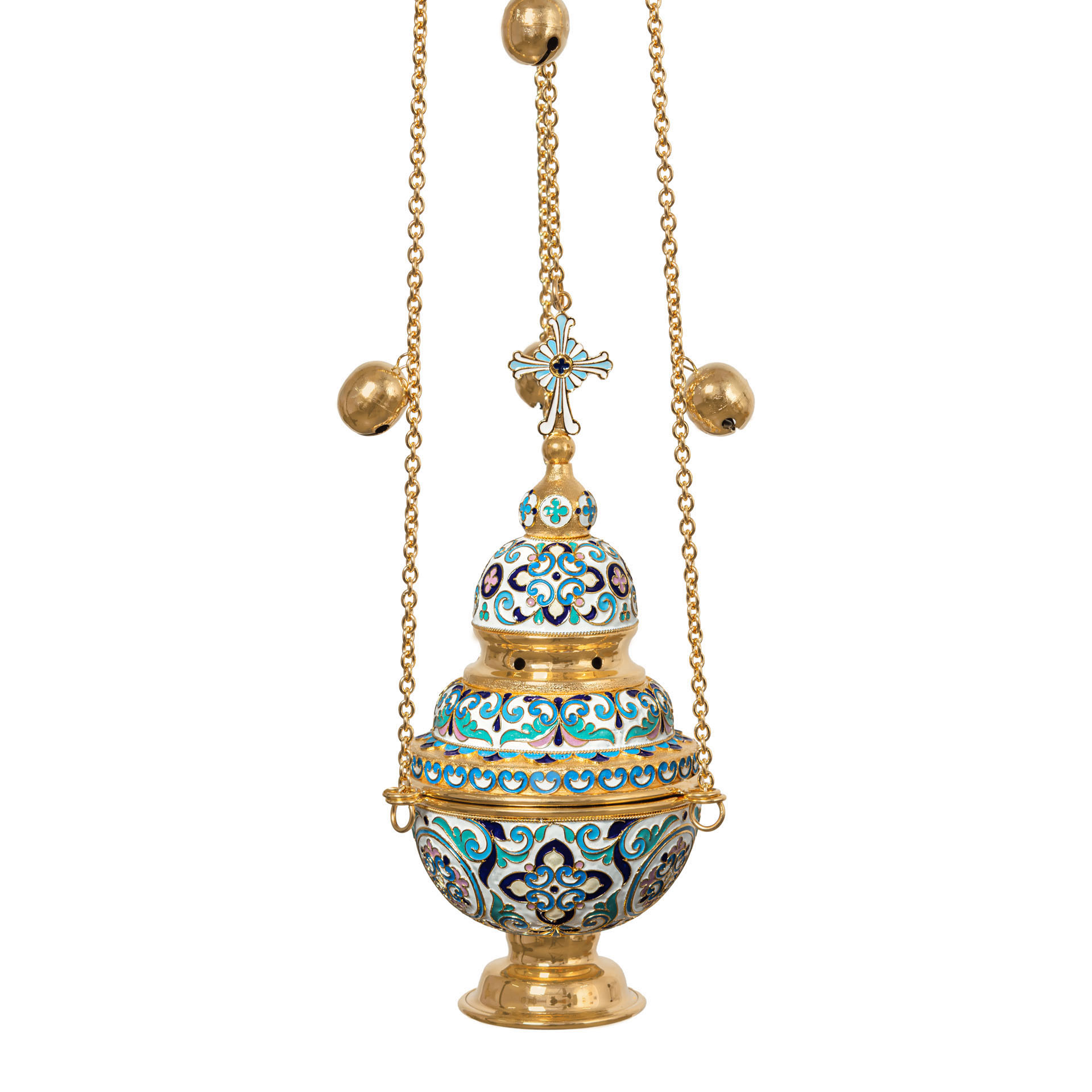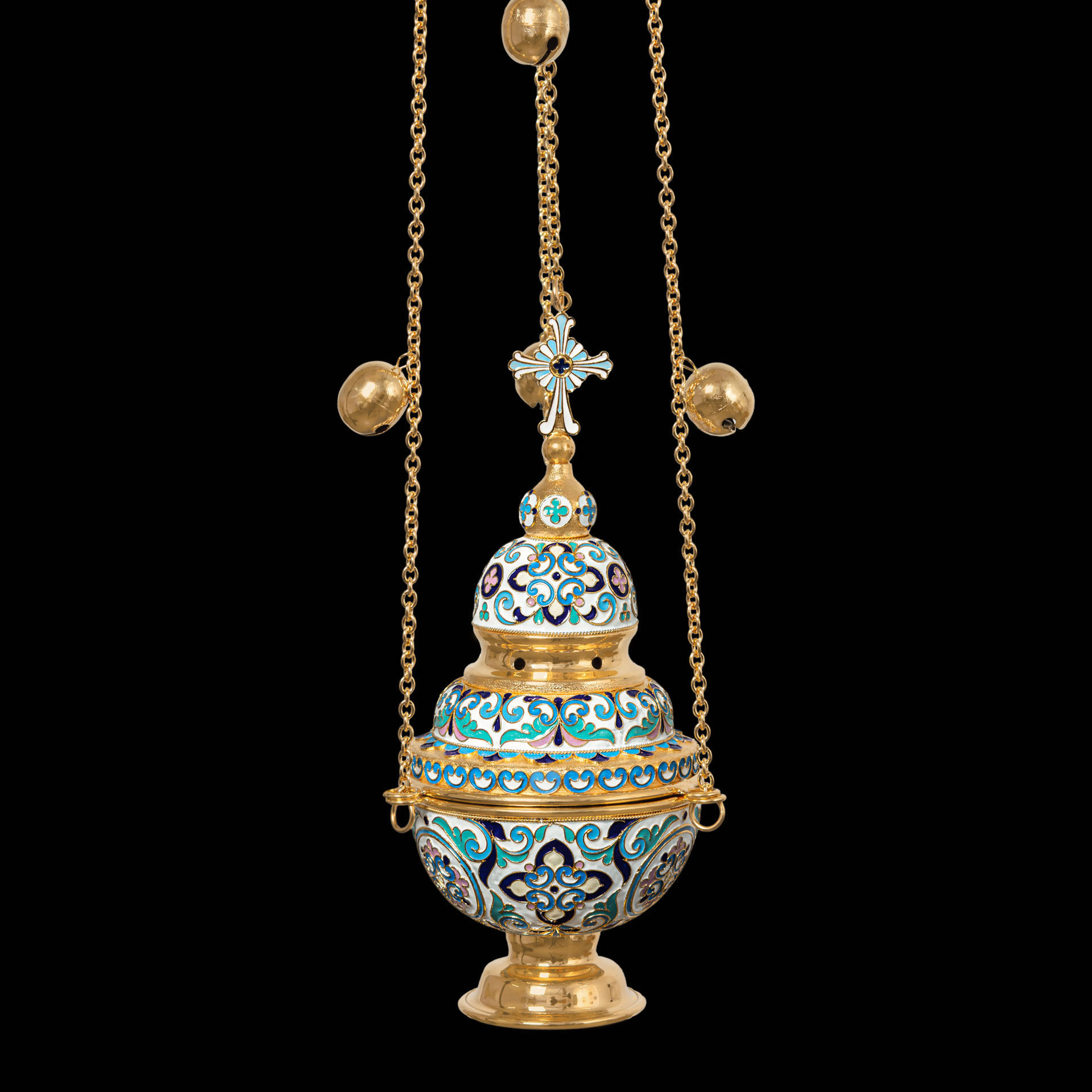 Праздничное и благородное кадило имеет необычную форму круглой трехэтажной часовни, увенчанной куполом и восьмиконечным крестом. Выполненное из латуни и меди и покрытое позолотой, кадило щедро украшено тонкими филигранными узорами и яркой эмалью, цвет которой может быть изменен. Крышка кадила имеет отверстия для циркуляции воздуха и выхода благовонного дыма.