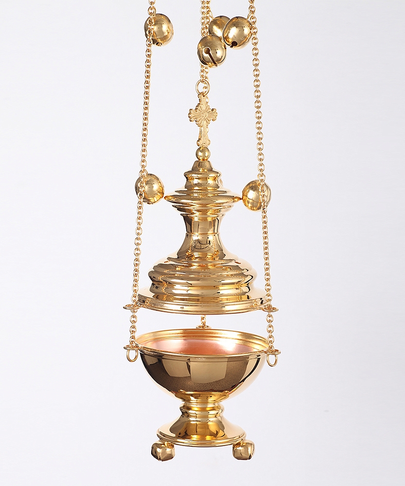 Позолоченное кадило имеет форму круглой вытянутой часовни, увенчанной четырехконечным крестом. Выполненное из латуни и меди, кадило имеет минималистичный дизайн, который впишется в интерьер любого храма. К изделию прилагаются круглый вкладыш и праздничные позвонцы.