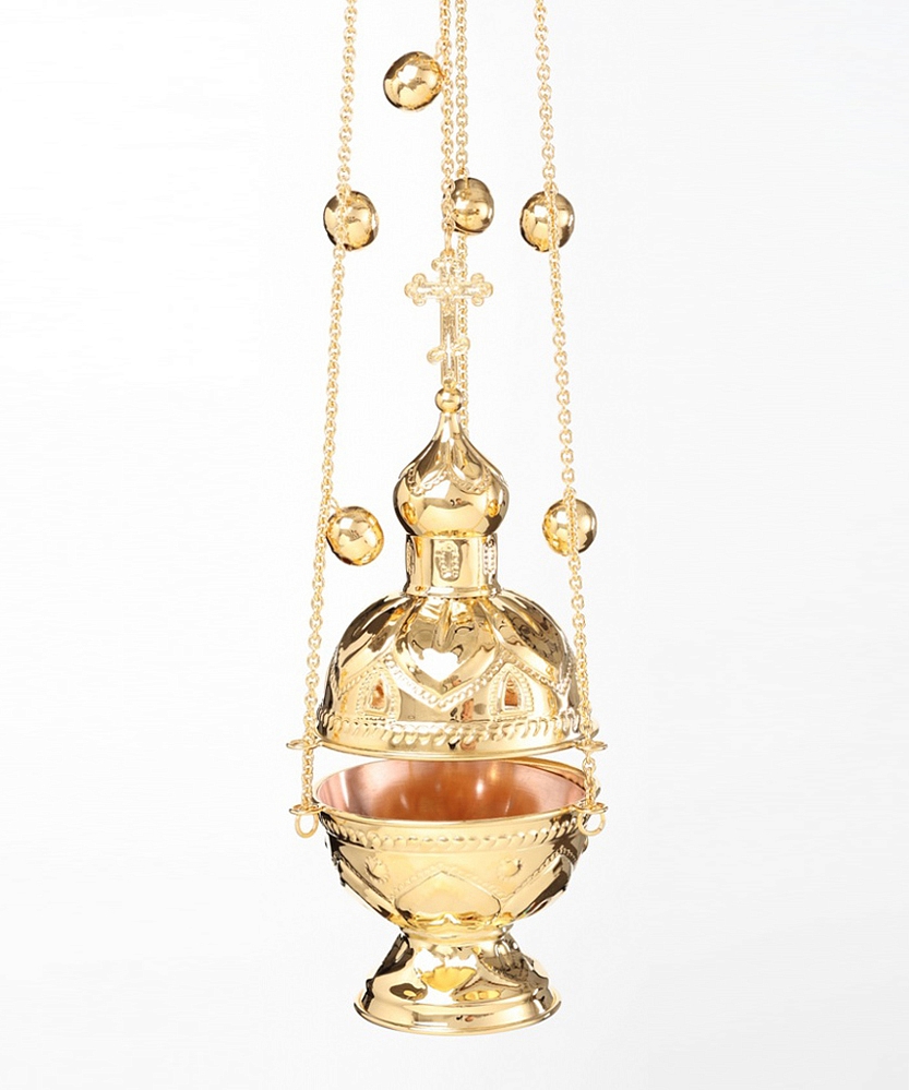 Царственное и благородное кадило имеет форму круглой часовни, увенчанной куполом и восьмиконечным крестом. Выполненное из латуни и меди и покрытое позолотой, кадило щедро украшено чеканными орнаментами. К изделию прилагаются круглый вкладыш и праздничные позвонцы.