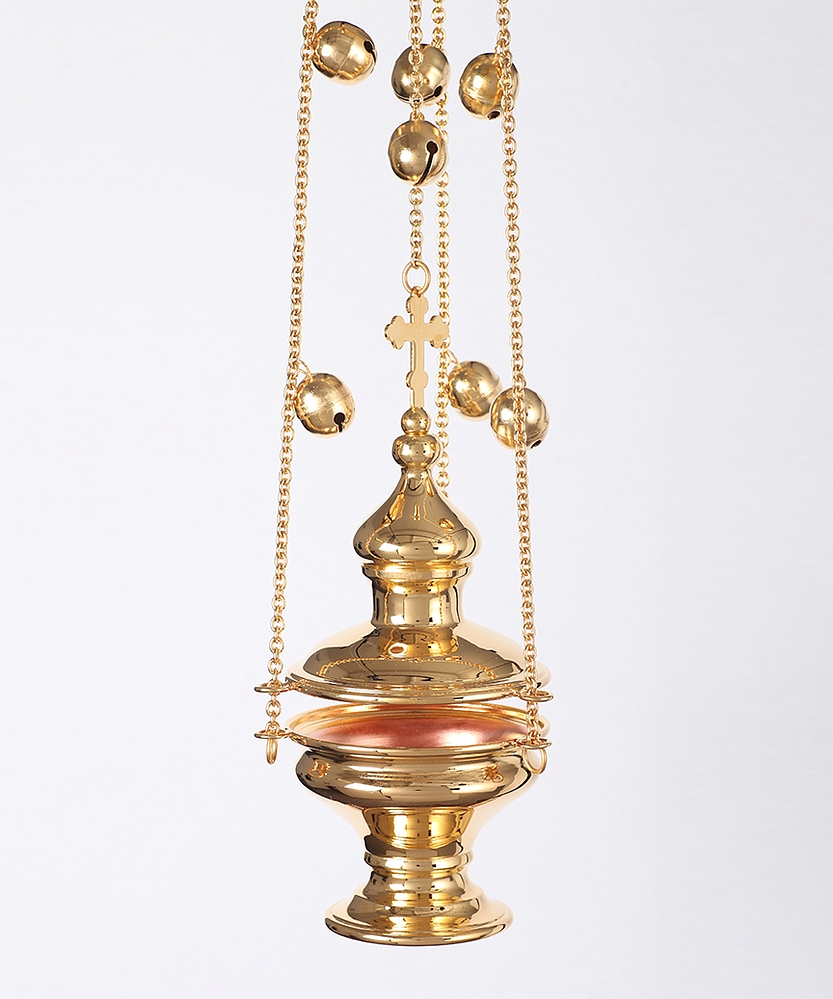 Минималистичное кадило имеет форму круглой часовни, увенчанной куполом и восьмиконечным крестом. Благодаря простому дизайну, оно впишется в интерьер любого храма. Выполненное из латуни и меди, оно покрыто сияющей позолотой. К изделию прилагаются круглый вкладыш и праздничные позвонцы.