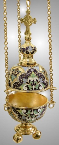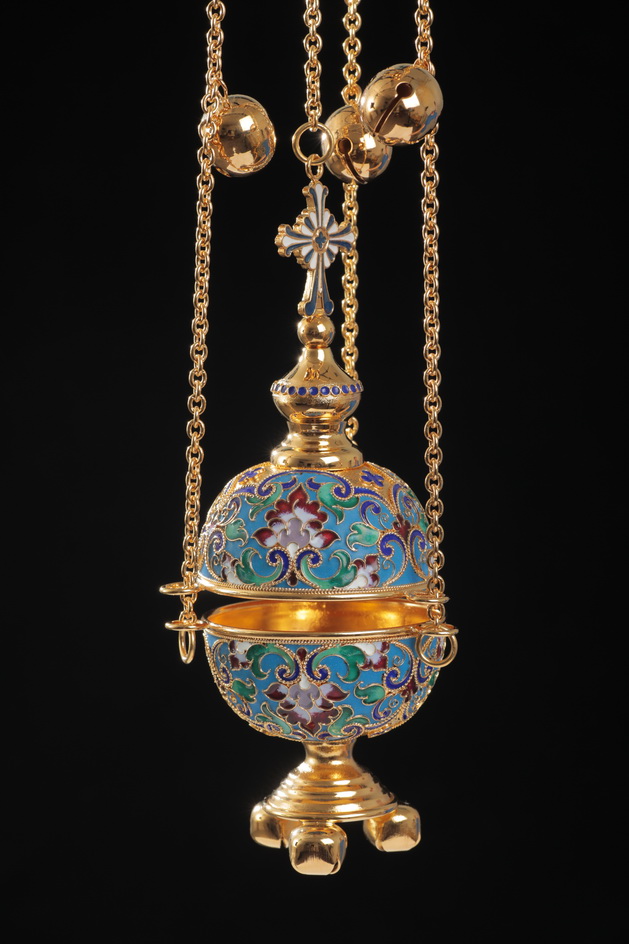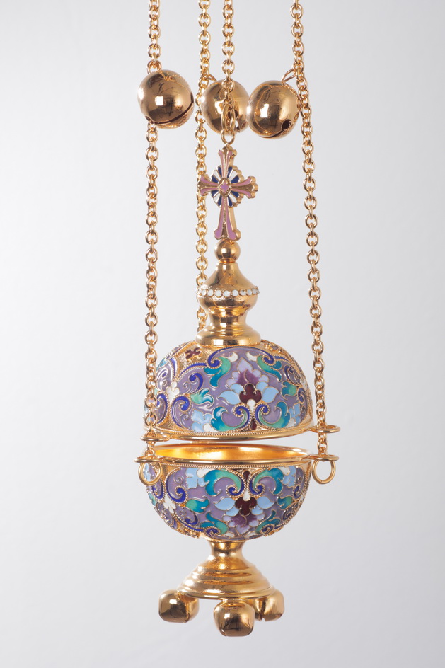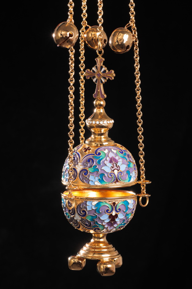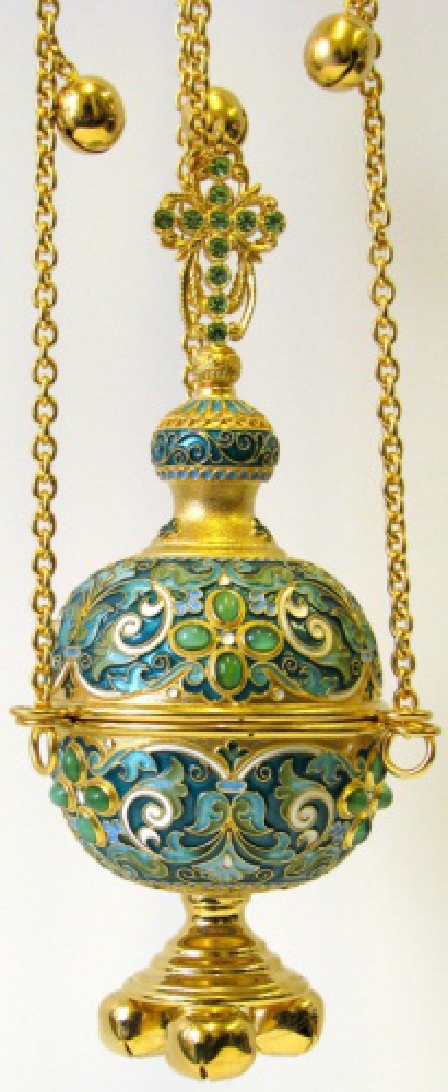 Разноцветное праздничное кадило напоминает искусно украшенное пасхальное яйцо, увенчанное куполом с четырехконечным крестом. Изделие выполнено из латуни и меди и покрыто позолотой, на фоне которой ярко выделяются филигранные узоры, раскрашенные цветной эмалью и дополненные мелкими блестящими камнями. Цвет эмали и камней может быть изменен по Вашему желанию.