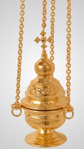 Позолоченная поверхность литого медно-латуневого кадила покрыта чеканными узорами. Крышка кадила увенчана четырехконечным крестом. Снизу кадило имеет устойчивую конусообразную подставку. К изделию прилагаются круглый вкладыш.