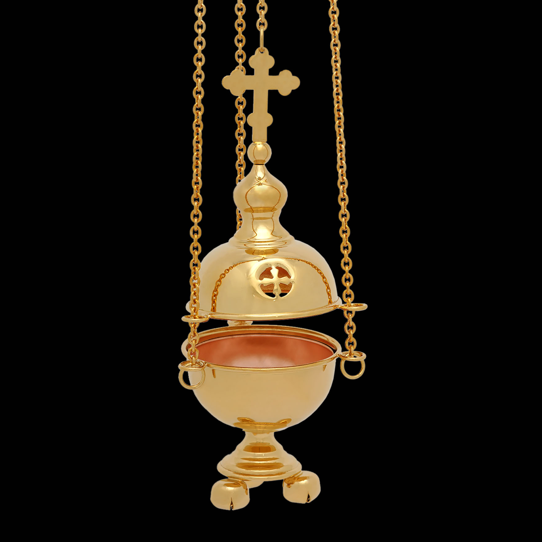 Позолоченное кадило из меди в форме круглой часовни идеально подходит на роль требного кадила. Крышка кадила, увенчанная восьмиконечным крестом, украшена прорезными четырехконечными крестами, которые выполняют роль отверстия для циркуляции воздуха и выхода благовонного дыма. К изделию прилагается круглый вкладыш, облегчающий чистку кадила.
