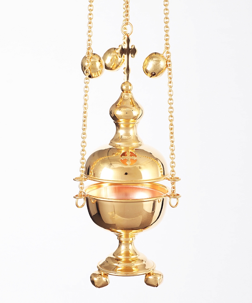 Классическое кадило из меди и латуни имеет форму круглой часовни, увенчанной куполом и восьмиконечным крестом. Озвученное позвонцами, кадило впишется в интерьер абсолютно любого храма. Крышка кадила украшена прорезными четырехконечными крестами, которые выполняют роль отверстия для циркуляции воздуха и выхода благовонного дыма. К изделию прилагаются круглый вкладыш, защищающий кадило от загрязнений, а также позвонцы.