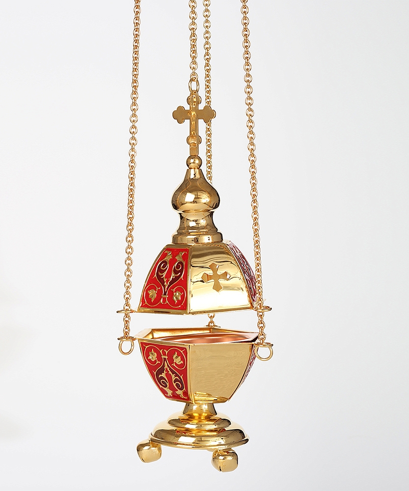 Позолоченное медно-латуневое кадило состоит из трех золотых и трех ярких эмалевых граней, чередующихся между собой. Позолоченные грани декорированы прорезными четырехконечными крестами, а эмалевые – тонкими растительными узорами. По Вашему желанию цвет эмали может быть красным, синим или зеленым. Изделие комплектуется шестигранным вкладышем.