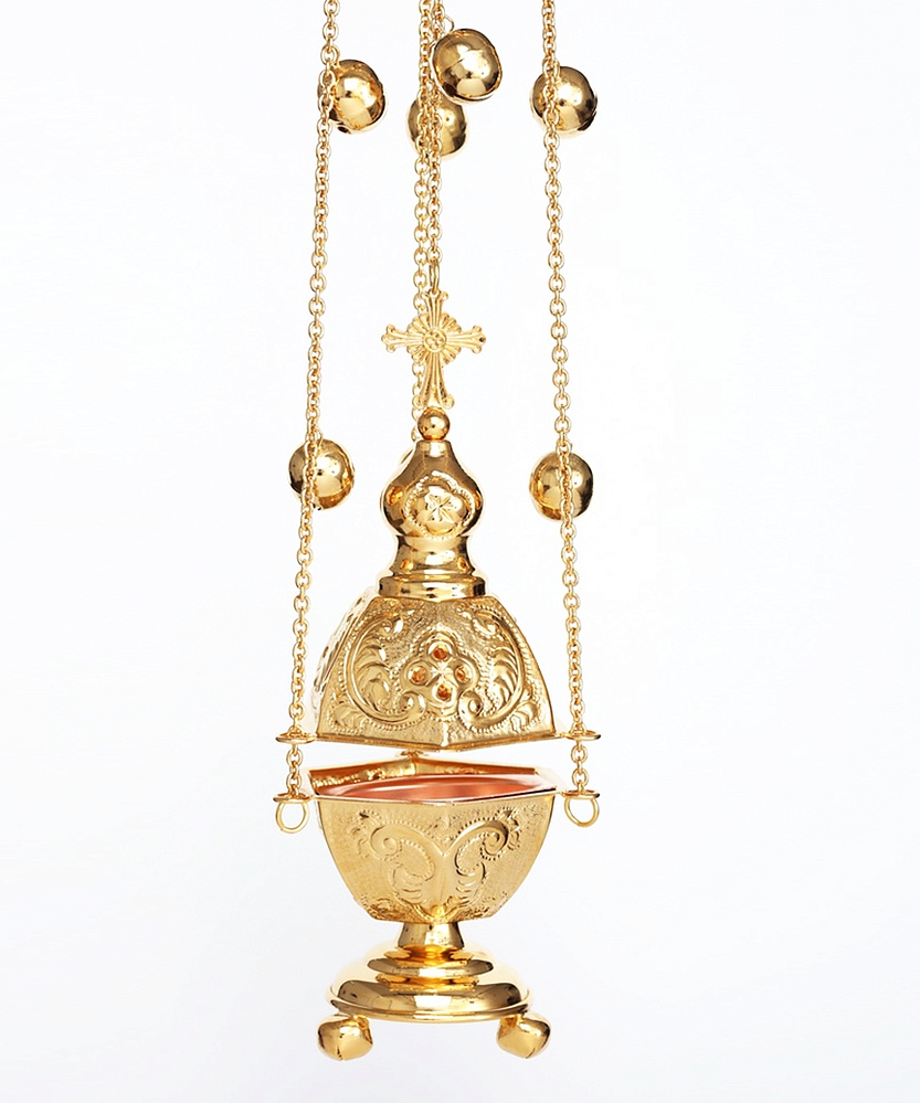 Шестигранное кадило выполнено из меди и латуни и покрыто позолотой. Поверхность кадила украшена чеканными узорами, а крышка увенчана четырехконечным крестом. Изделие комплектуется вкладышем и позвонцами.