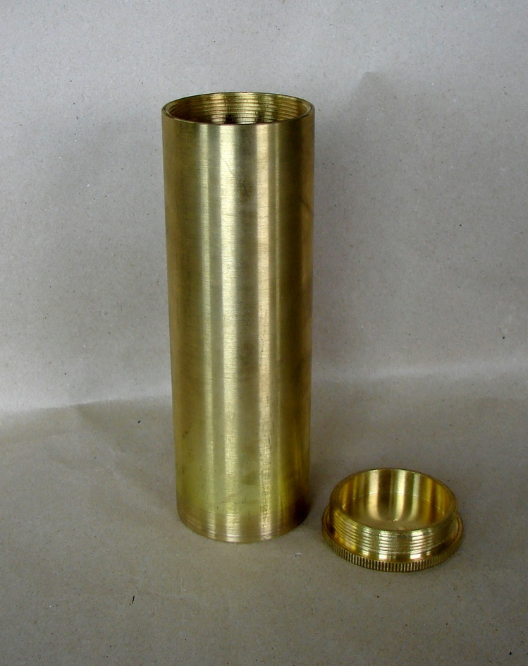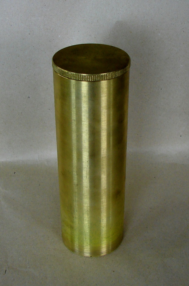 Латуневая капсула для закладки храма представляет собой цилиндр высотой 23 см темного металлического цвета с золотым отливом. Капсула плотно закрывается крышкой, поэтому вложенная внутрь грамота будет надежно защищена от деформации. Диаметр крышки - 8,5 см, высота - 2,3 см. Диаметр капсулы - 8,5 см, высота - 23 см.
