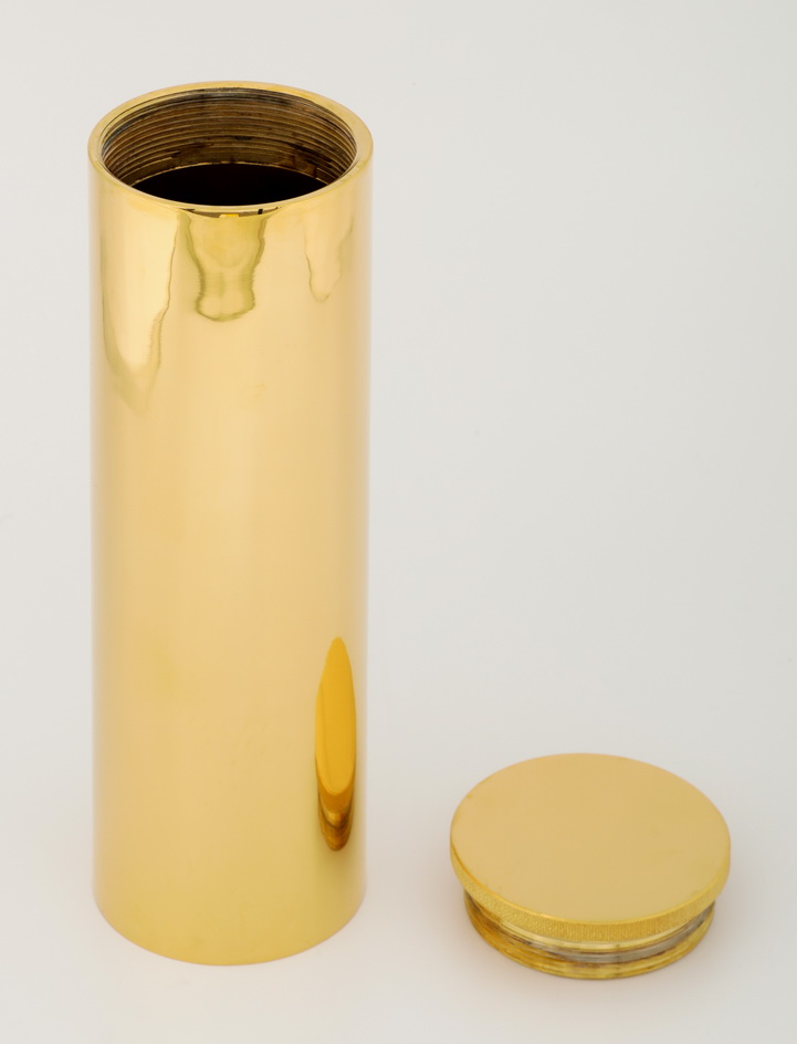 Торжественная позолоченная капсула для закладки храма представляет собой цилиндр высотой 23 см темного металлического цвета с золотым отливом. Капсула плотно закрывается крышкой, поэтому вложенная внутрь грамота будет надежно защищена от деформации. Диаметр крышки - 8,5 см, высота - 2,3 см. Диаметр капсулы - 8,5 см, высота - 23 см.