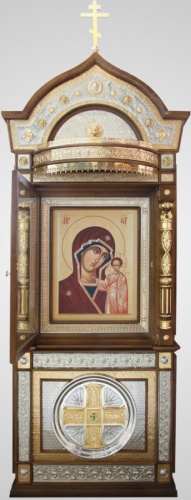 Золочение деревянных элементов сусальным золотом. Иконы - фотопечать на холсте.Толщина киота по основанию 300 мм.