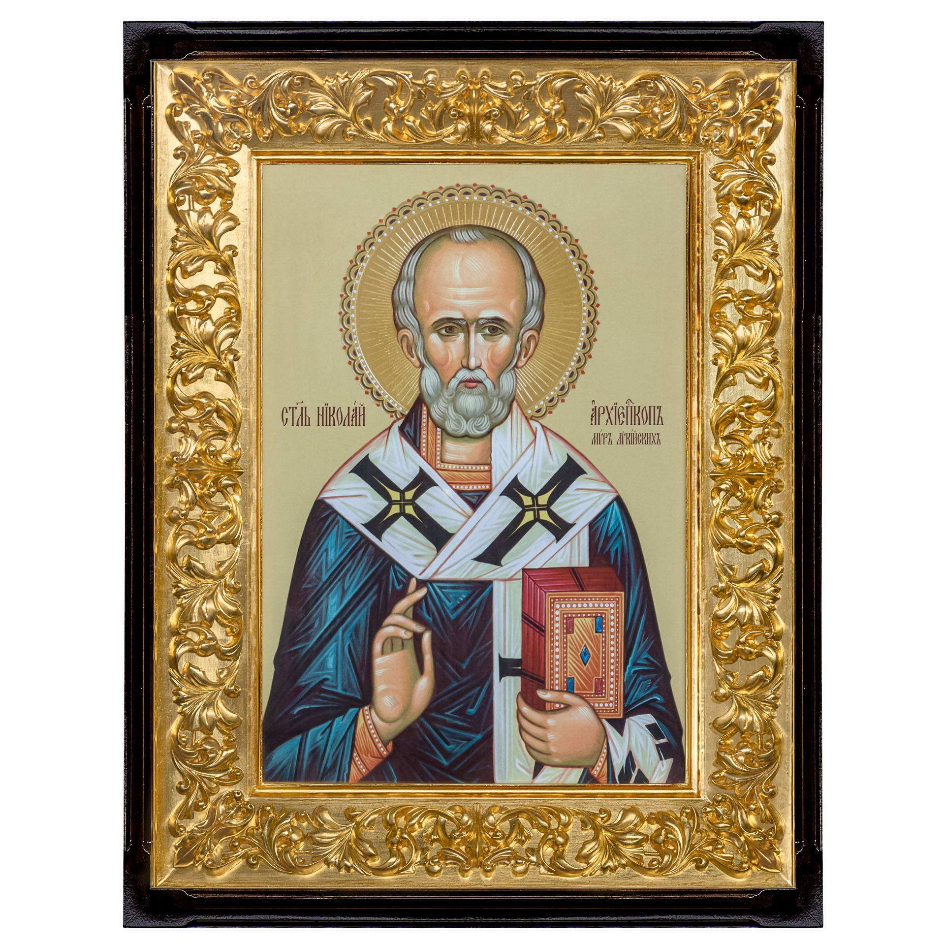 Киот настенный 70х90 с резным золоченым подрамником, с иконой на канвасе Николай Чудотворец