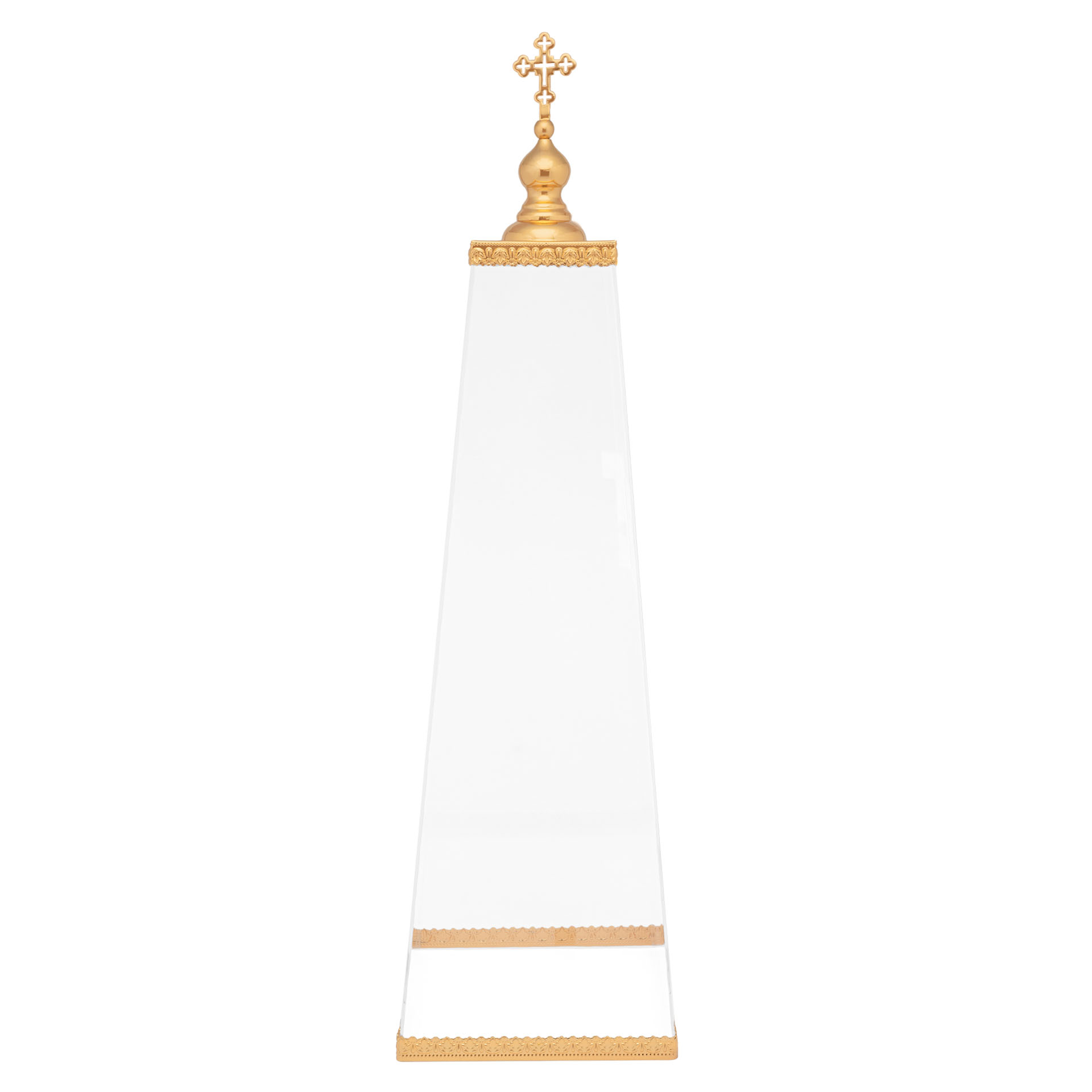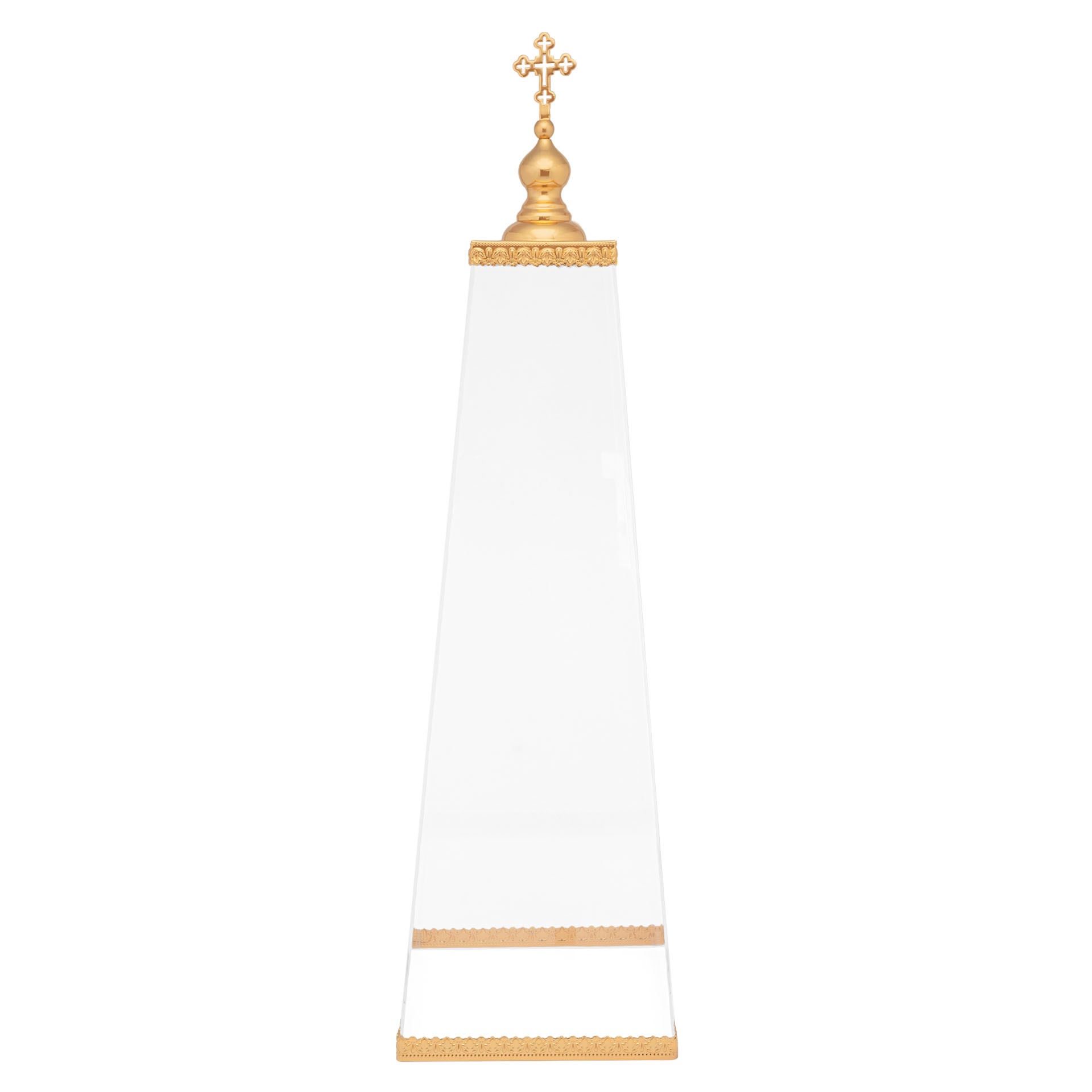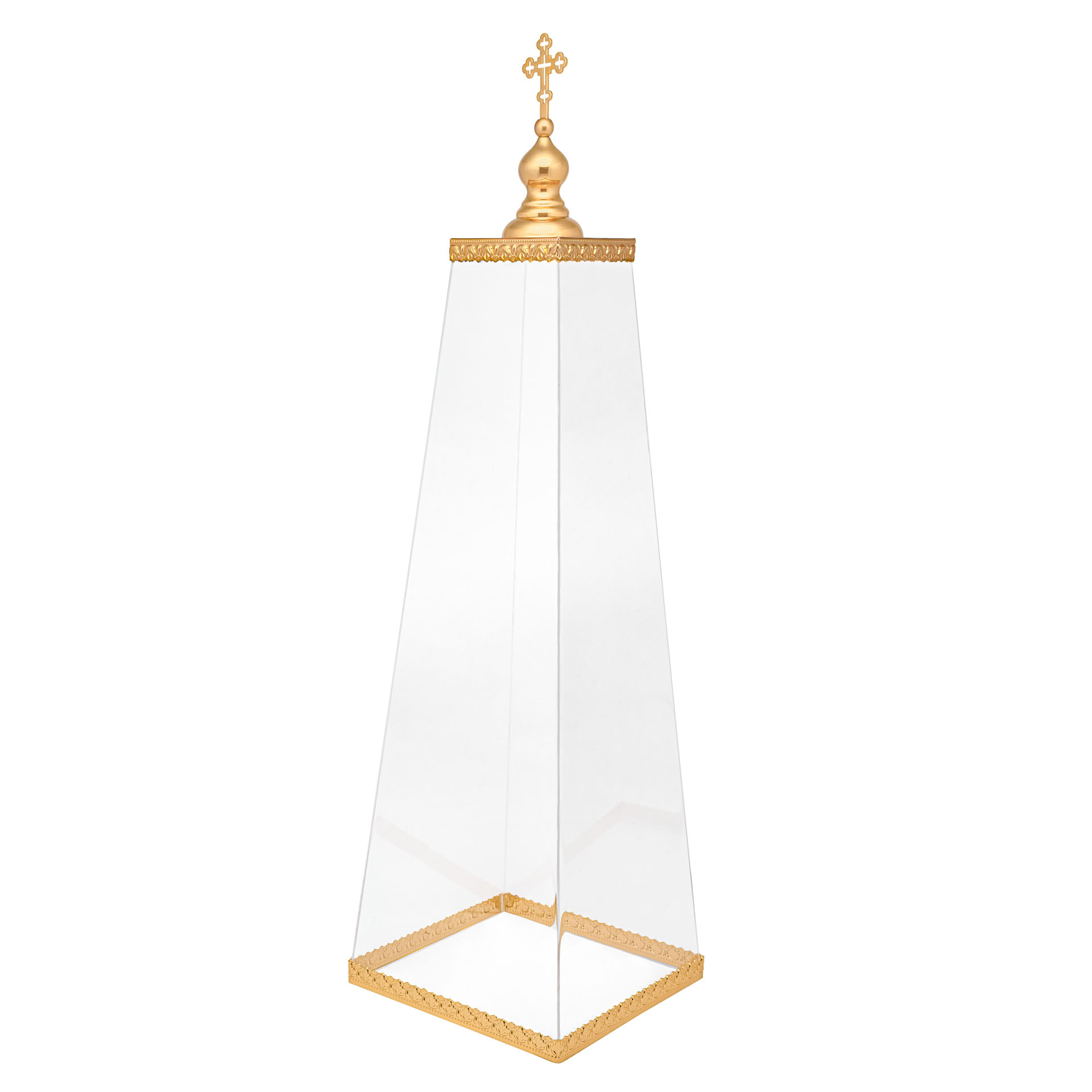 Стандартный колпак из органического стекла защитит дарохранительницу от повреждений и пыли. Благодаря простому дизайну, изделие впишется в интерьер практически любого храма. Снизу колпак украшен геометрическим узором, а сверху – крестом, но позолоченные металлические детали, выполненные из латуни, не утяжеляют изделие – оно весит всего 1,65 кг.