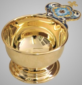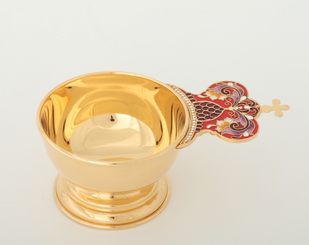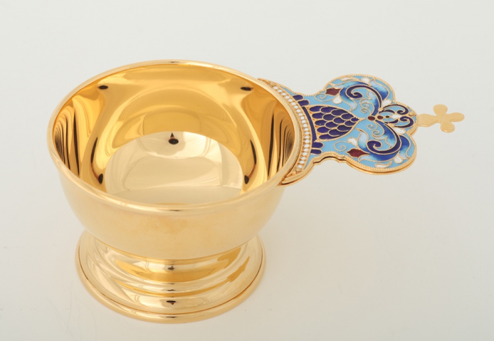 Праздничный ковш для теплоты, выполненный из латуни и меди, сразу привлекает к себе внимание яркой ручкой. Широкая плоская ручка, увенчанная позолоченным четырёхконечным крестом, украшена тонкими филигранными узорами и раскрашена сияющей эмалью. Цвет эмали может быть изменен по пожеланию заказчика.