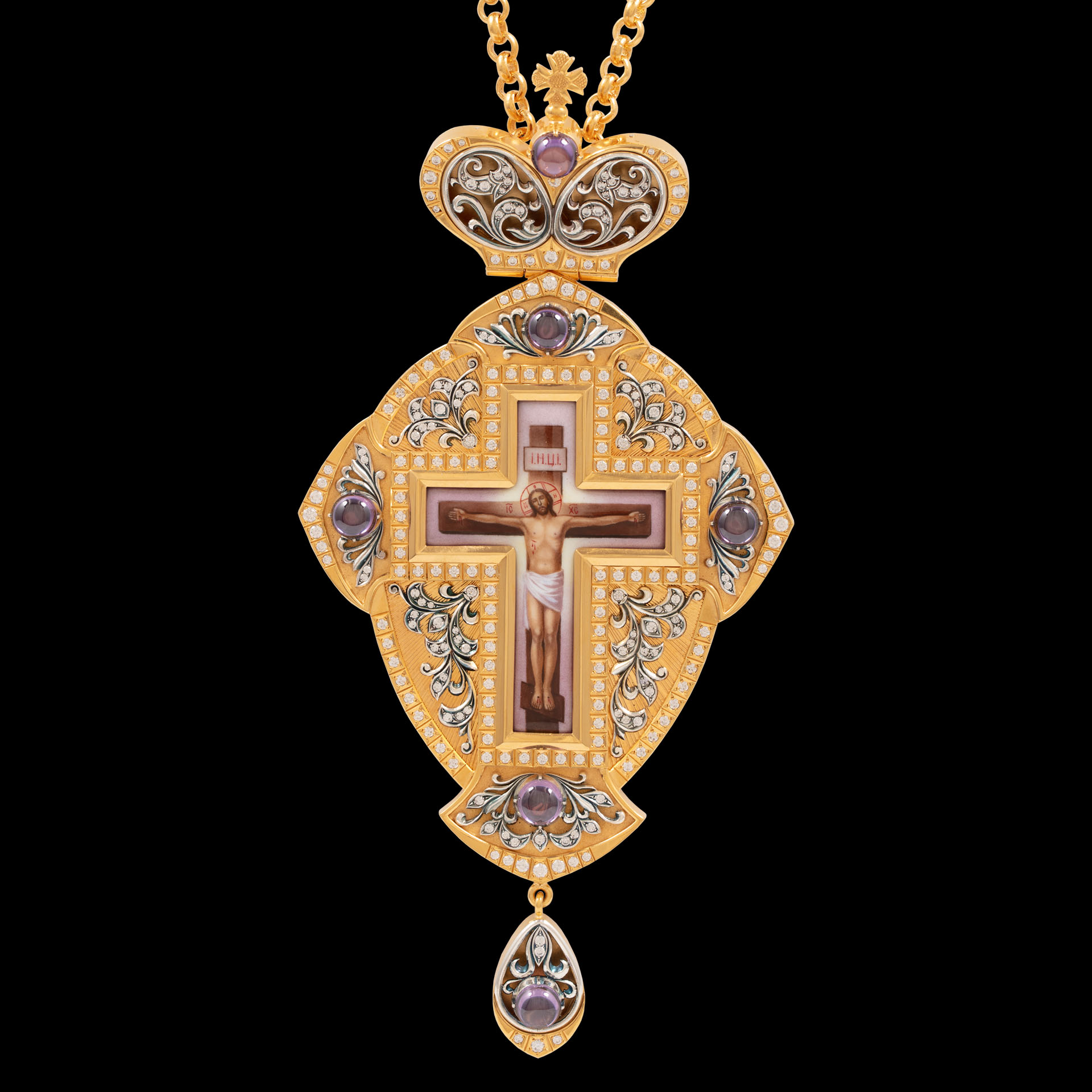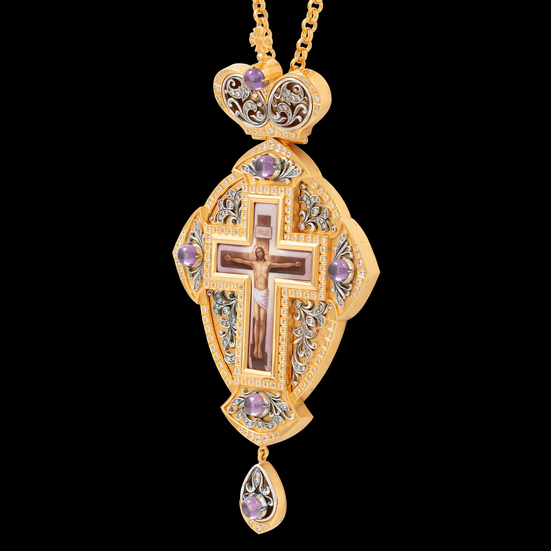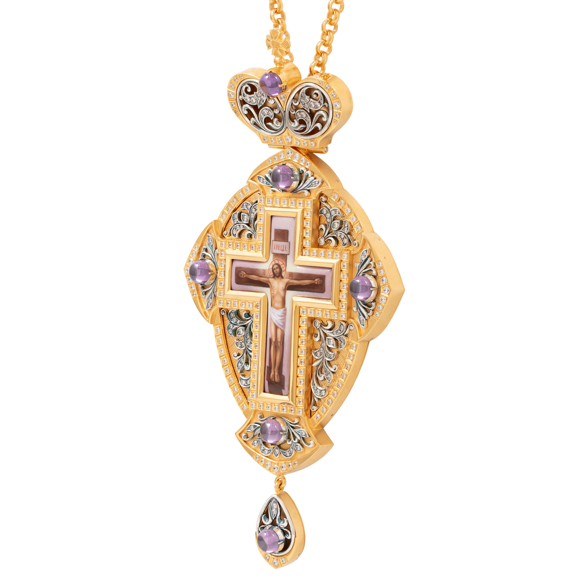 Крест архиерейский №1286 / Фианиты / золочение / серебро финифть, гильяш (УИН)